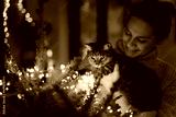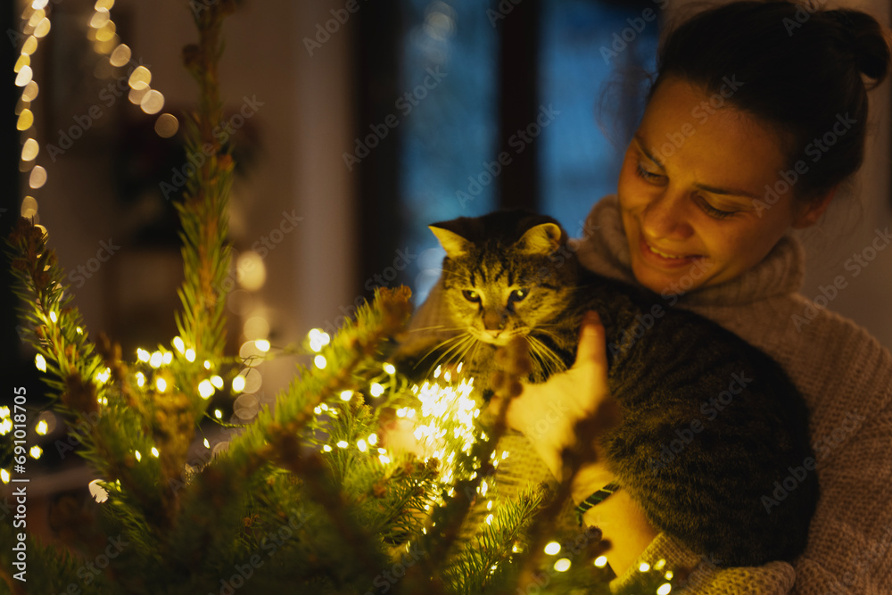 Young woman decorating a Christmas tree with a gray cat in her arms. Coziness at home during the holidays