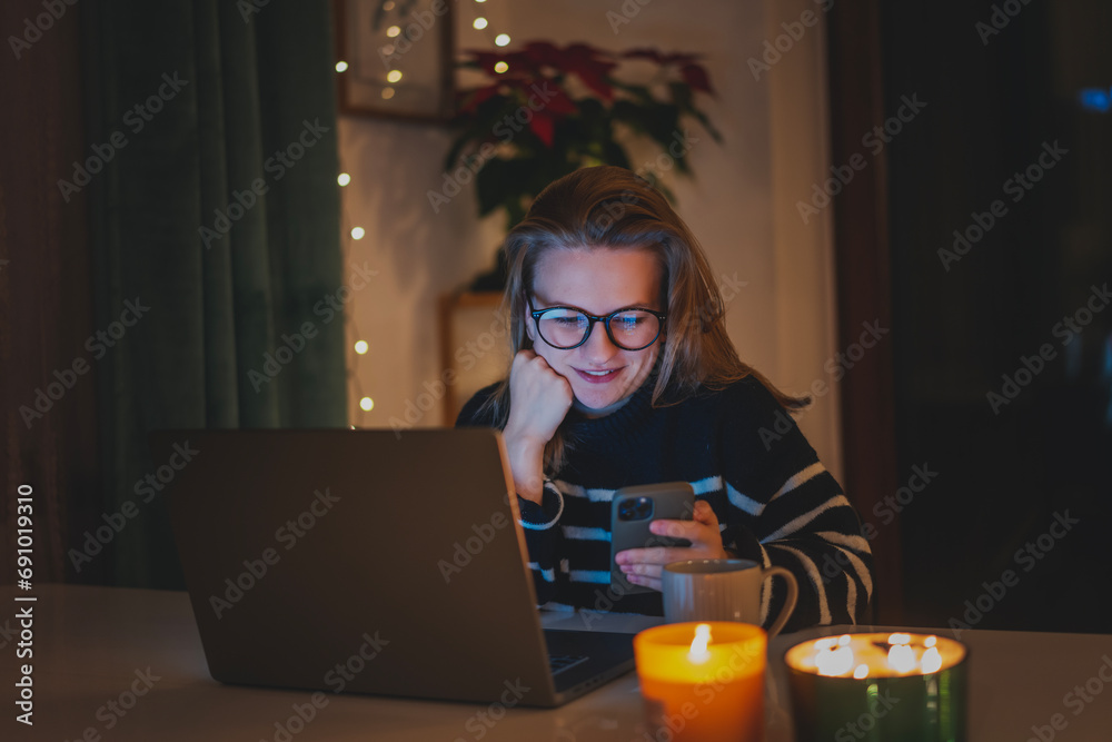 Young woman using laptop and smartphone while sitting at home during Christmas holidays. Cozy Christmas evening with candles