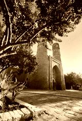 Chor Minor madrasah in center of Bukhara Uzbekistan