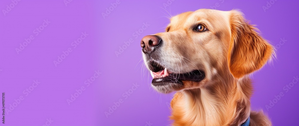 A close-up portrait of a golden retriever puppy on a purple background