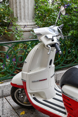 Vintage red and white motor scooter bike in the park