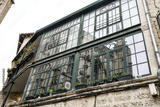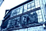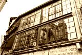 Ancient medieval church in glass window reflection