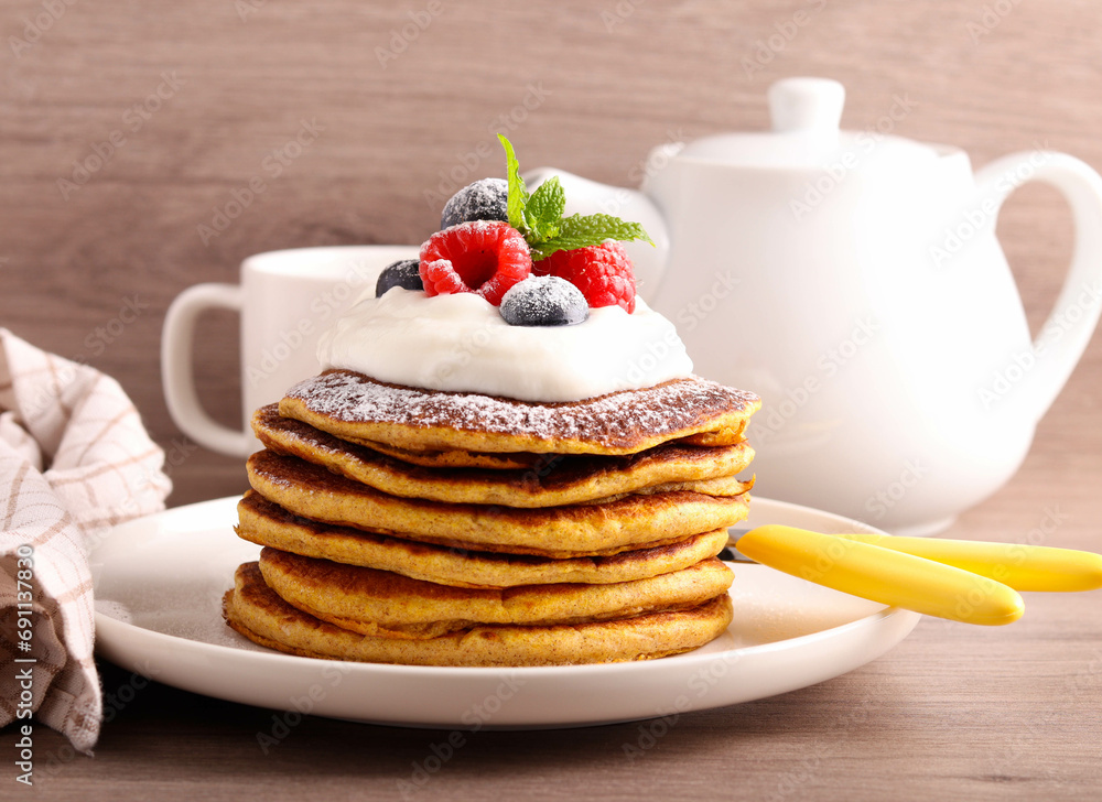 pancakes with cream and berries