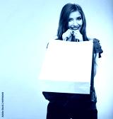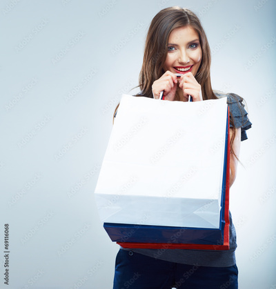 Portrait of happy smiling woman hold shopping bag. Female mode