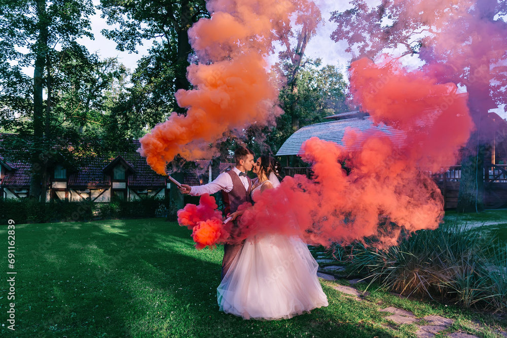 Bride and groom with red smoke bombs in summer park. Groom and bride with colored smoke on the background of the summer forest.