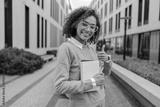 Smiling female freelancer standing with note pads on modern building backgrounds