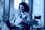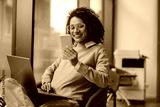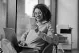 Stylish business woman is use phone while working on laptop in modern office near window
