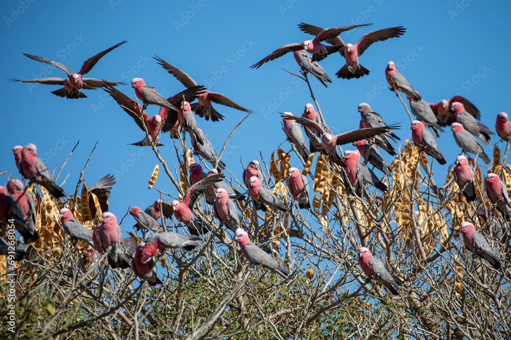 A flock of Galahs (Eolophus rosieicapilla) or pink and grey cockatoos. Far North Queensland.