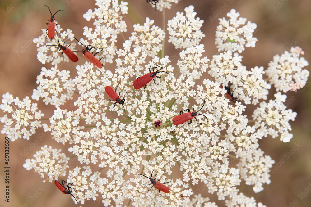 Lygistopterus sanguineus, flores Zanahoria silvestre.