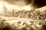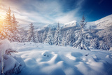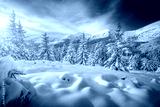Snowy landscape and white spruces trees on a frosty day. Carpathian mountains, Ukraine, Europe.