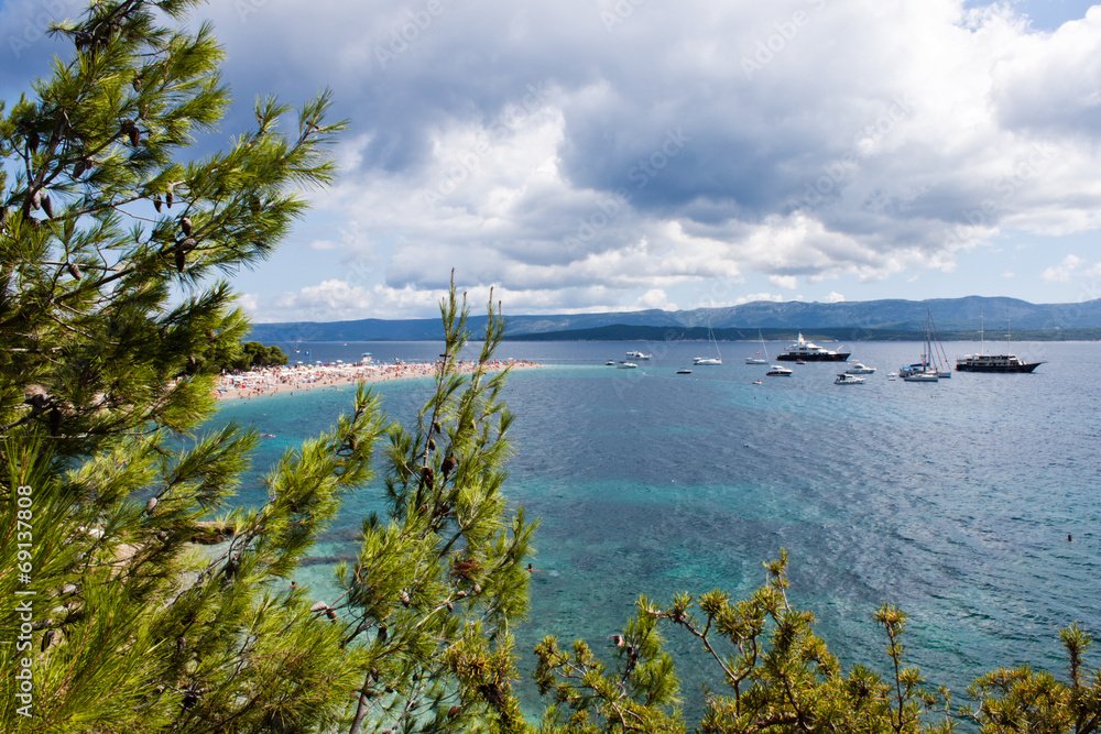 Plaża oraz skaliste wybrzeże, morze i jachty
