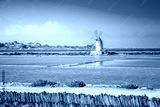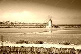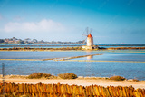 Ancient windmill for grinding salt in salt flats. Trapani province, Sicily, Italy, Europe.