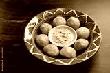 Paniyaram are savory balls made using fermented rice and urad dal batter along with tempered onion and spices. Also known as Paddu, Ponganalu, Kuli, bugga, and appe. served with coconut chutney