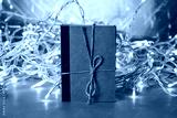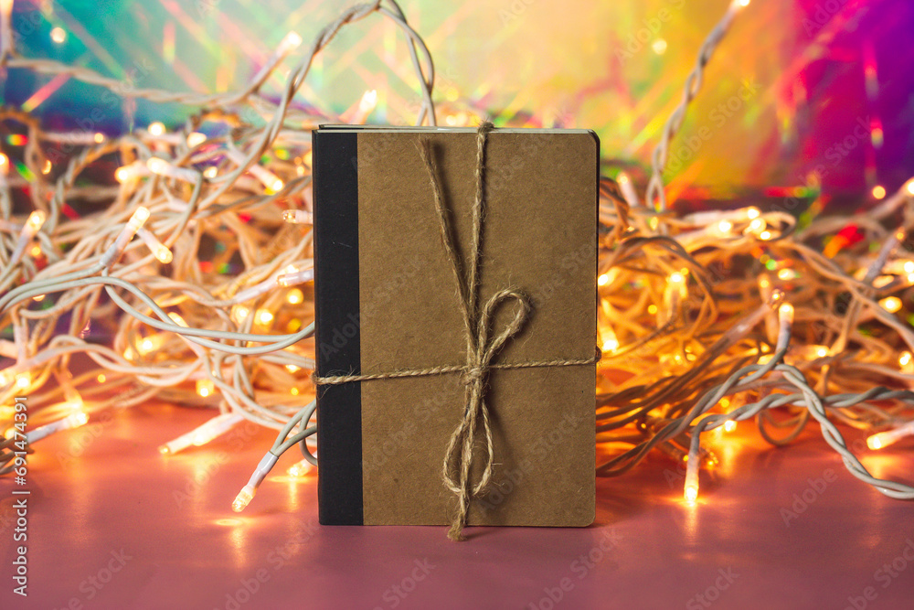 Kraft paper notebook tied with rope batting against glittering lights ice garlands. New Year's Eve, Christmas holiday present. Keep your secrets inside diary. Wrapped gift in a cardboard box Dark key.