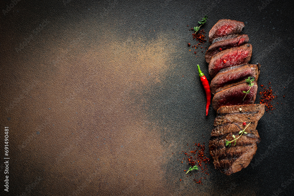 Juicy steak medium rare beef on a dark background. top view. copy space for text