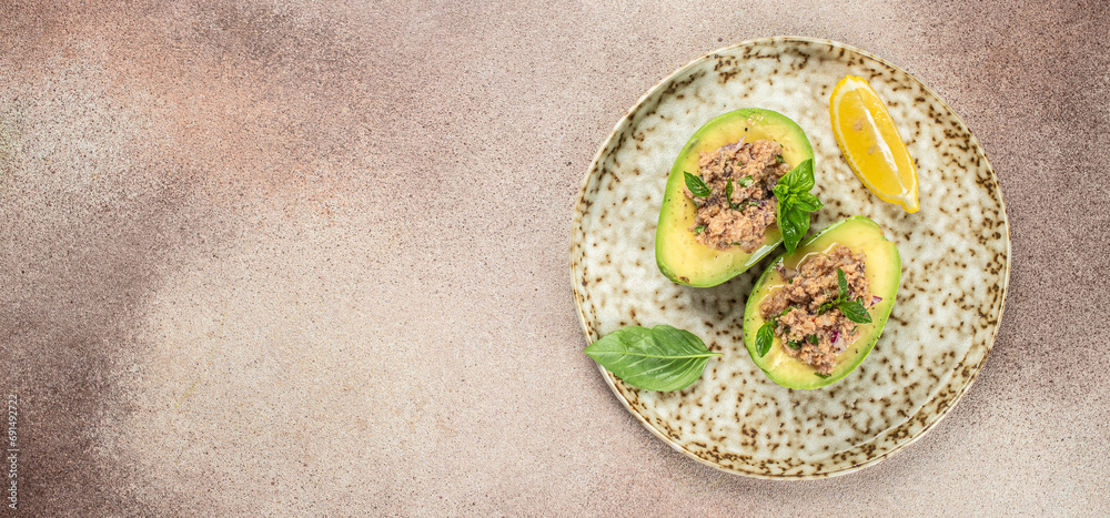 Tuna stuffed avocado on plate. Concept healthy and balanced eating. Long banner format. top view. copy space for text