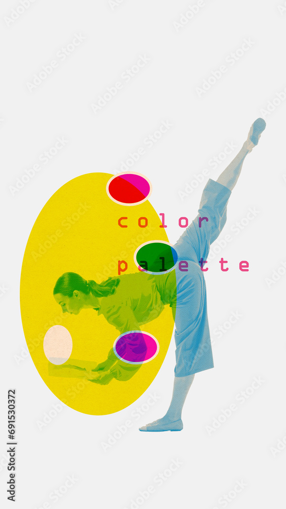 Web designer. Young woman working on laptop, creating website for company. Ux ui designer. Contemporary art collage. Concept of design and development, creativity, business, freelance