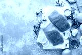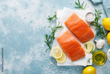 Salmon. Fresh raw salmon fish fillet with cooking ingredients, herbs and lemon, top view