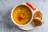 Bowl of white bean soup with rye bread cheese sandwich, healthy comfort food, top view