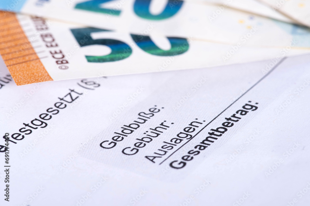 Euro Geldscheine und ein Bußgeldbescheid für ein Vergehen im Straßenverkehr