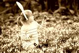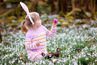 Little girl with Easter bunny ears making egg hunt in spring forest on sunny day, outdoors. Cute happy child with lots of snowdrop flowers and colored eggs. Springtime, christian holiday concept.