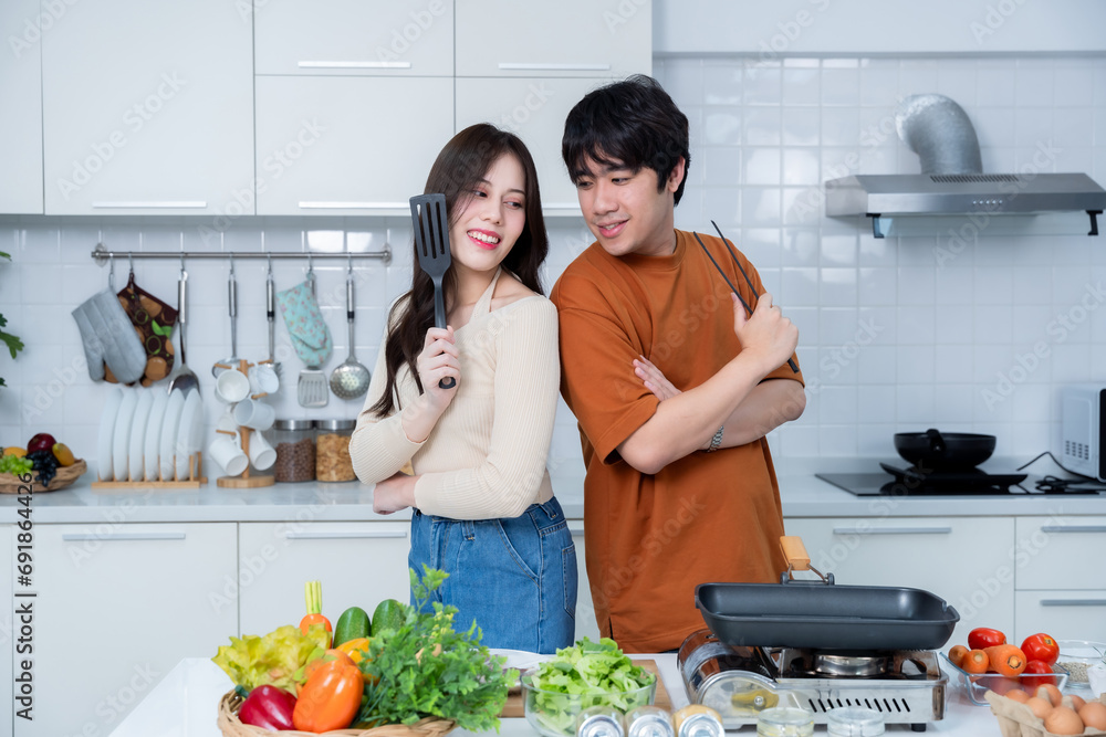Happy Family portrait of loving young asian of having fun standing a cheerful preparing food and enjoy cook cooking with vegetables, meat, bread while standing on a kitchen Condo life or home
