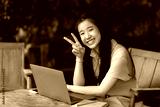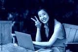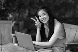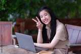 Happy of Young asian teen girl college student using laptop computer writing on pc working from at the cafe.Online education, elearning concept,freelance people businessfemale