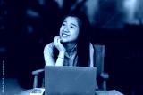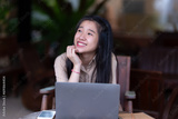 Happy of Young asian teen girl college student using laptop computer writing on pc working from at the cafe.Online education, elearning concept,freelance people businessfemale