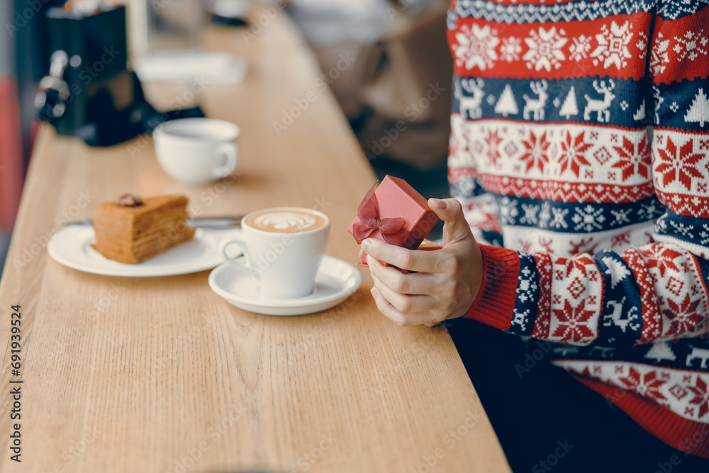 young woman opens a charming red gift box, adding a touch of holiday magic to her coffee shop visit
