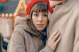 A young woman rests her head on her partner's shoulder, finding solace in his warm embrace amidst the Christmas market's glow.