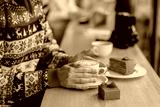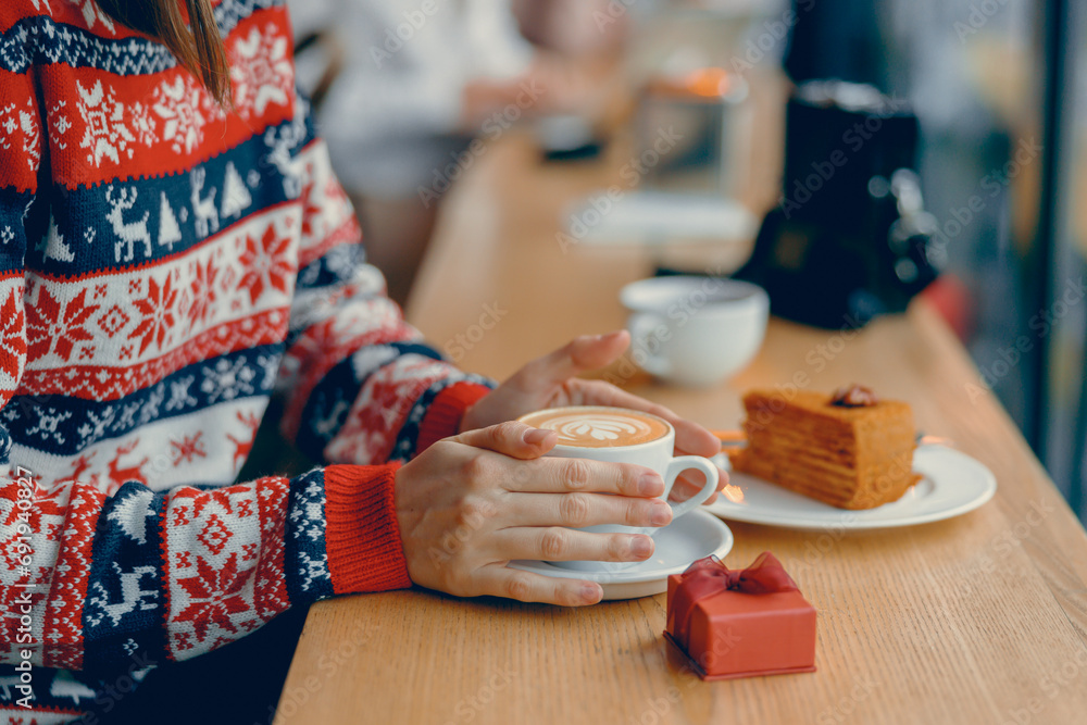Young woman enjoying a warm cup of tea in a festive sweater at a charming cafe