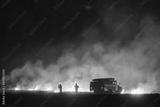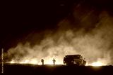 Terrible wild huge fire on the horizon at night in the field. Fire engine on a background of flames and smoke. A large fire scorched the vegetation on the side of the road