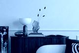 Minimalist composition of living room interior with wooden sideboard, glass vase with dried flowers, marble lamp, books, white sofa, blue pillow and personal accessories. Home decor. Template.