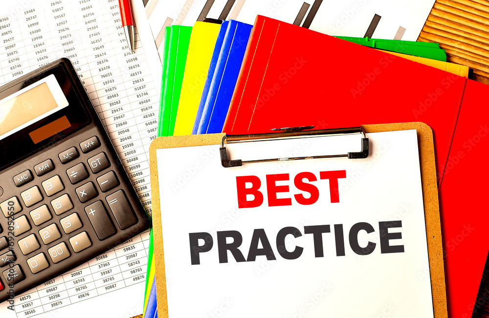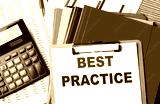 BEST PRACTICE text written on paper clipboard with chart and calculator