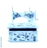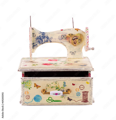 Jewelry case with sewing machine.