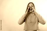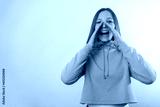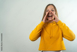 Surprised happy beauty young girl looking copy space in excitement. Expressive facial expressions. Presenting some product. Beautiful girl act like a telling secret Isolated on grey background