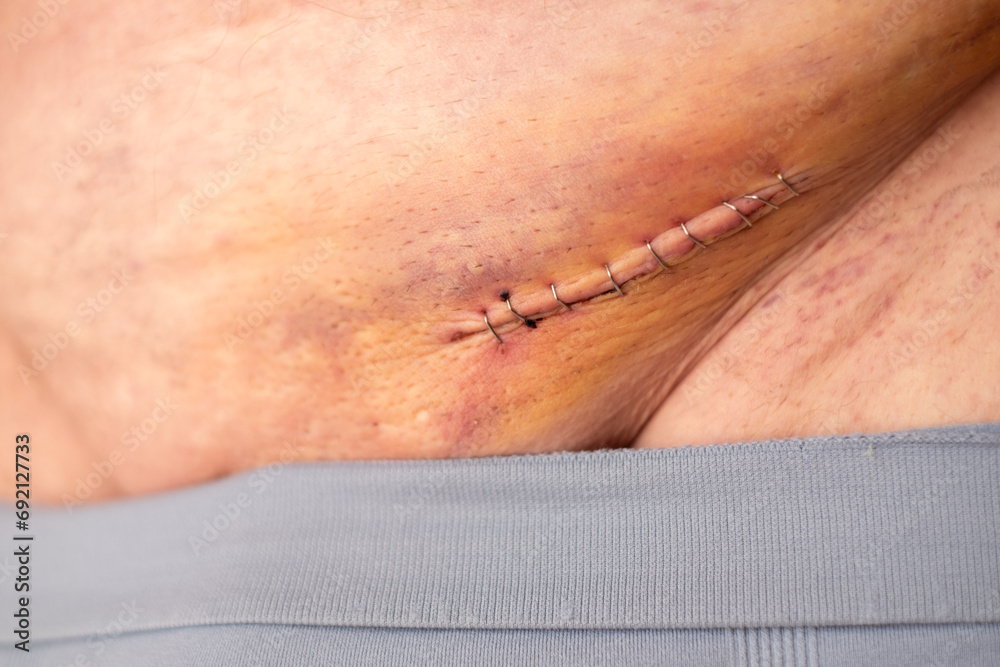 Nine staples to the groin scar on the body of an elderly gentleman after an inguinal hernia operation