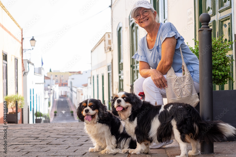 Smiling elderly woman with hat sitting on the street with her two cavalier king charles spaniel dogs. Attractive mature lady outdoors with her best animal friends