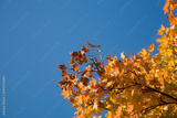 Bunte wirbelnde Ahornblätter im Herbst bei blauem Himmel