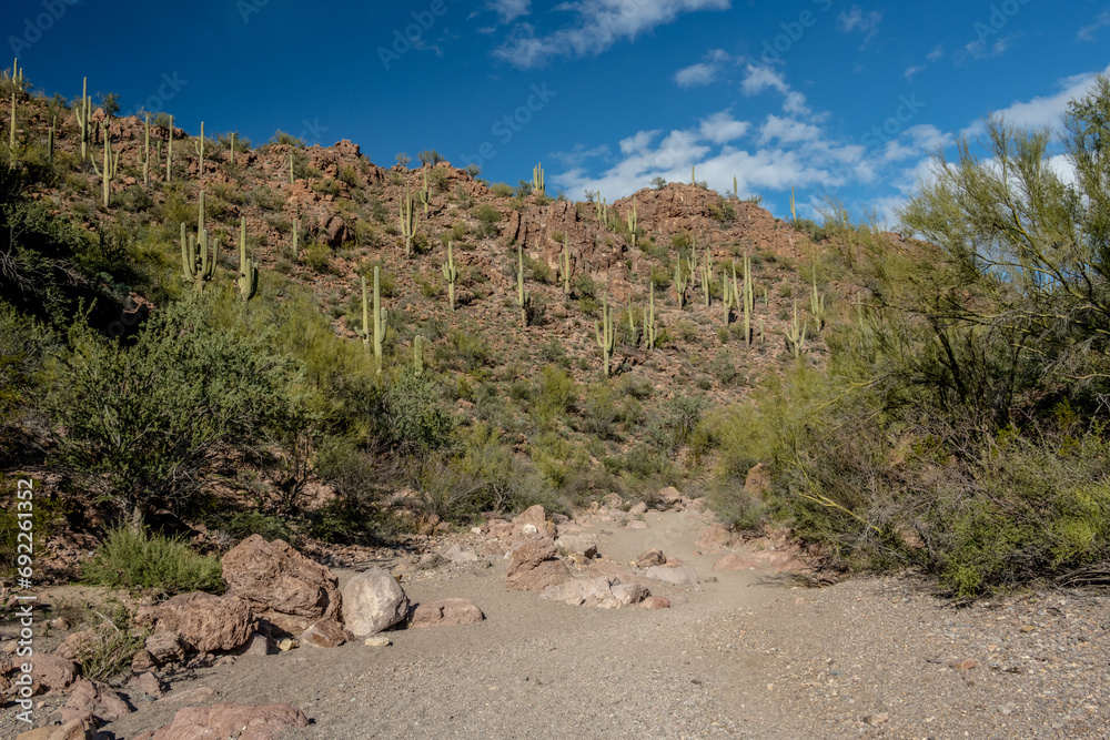 Saguaro Cactus Grow Tall Over A Dry Wash In Saguaro