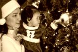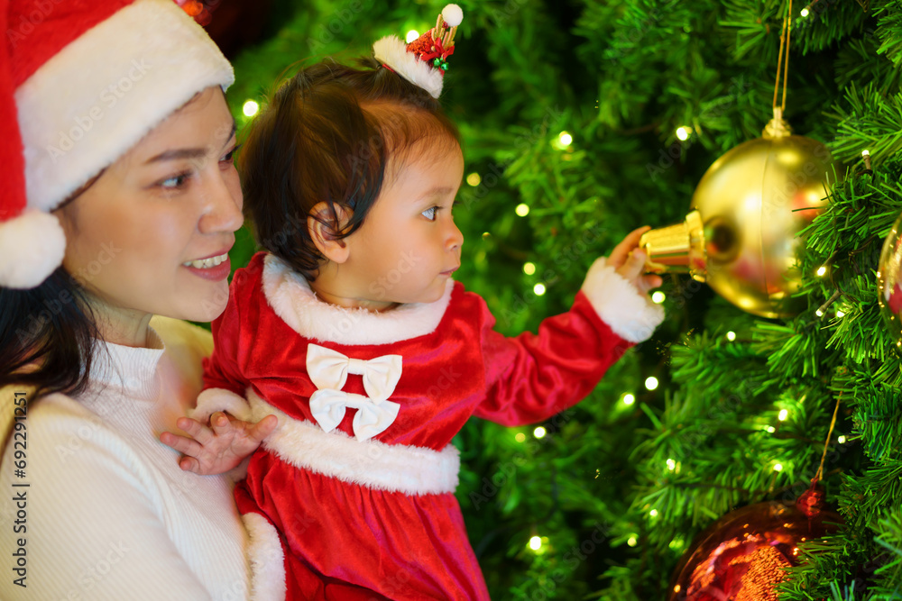 happy mother with daughter in santa dress playing christmas ball and tree. happy new year eve