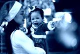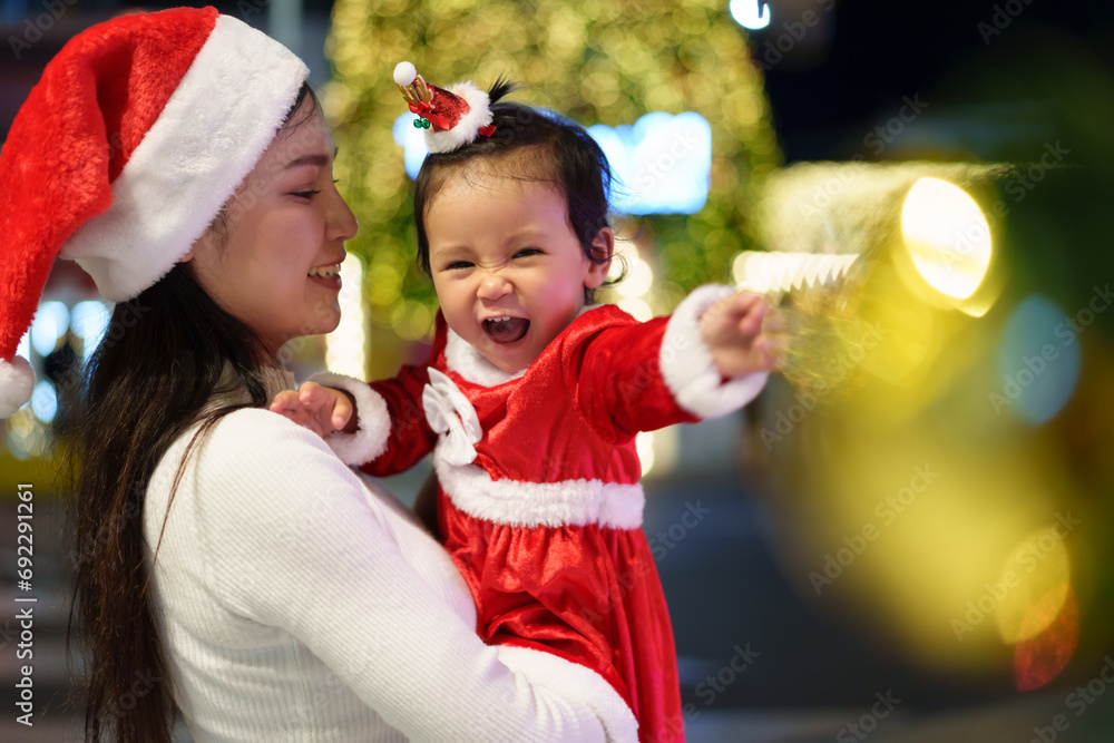 cheerful mother with daughter in santa dress and christmas light at night. happy new year eve
