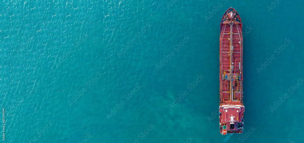 Aerial top view of oil tanker ship at sea, Crude oil tanker industrial, Oil tanker import export business logistic, Industrial crude oil and fuel tanker ship deep blue open ocean sea.