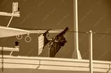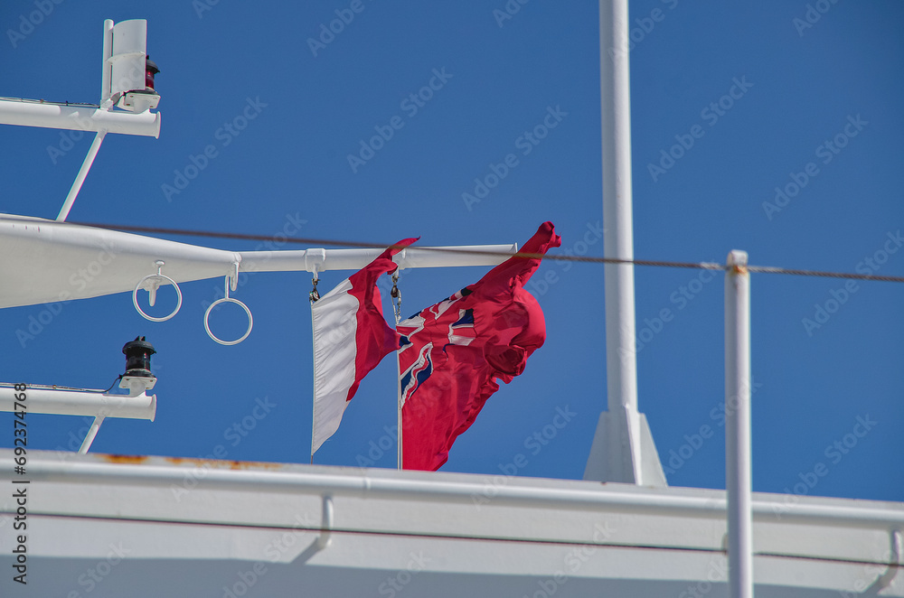 Detail view of Mast with flying flags of luxury British cruiseship cruise ship liner against blue sky