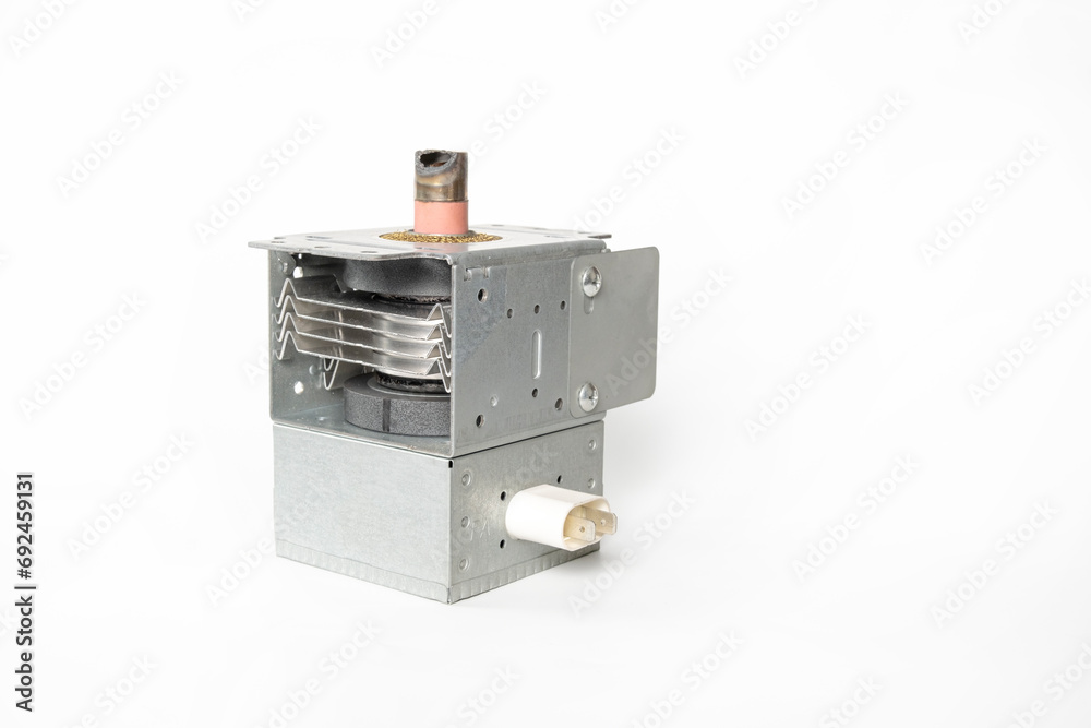Magnetron on a white background. Magnetron with a burnt metal cap. Magnetron from a microwave oven, the cause of sparks and smoke from a microwave oven.