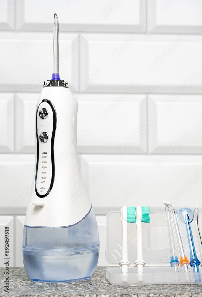 Individual irrigator against the background of a wall in the bathroom. Place for text. cope space