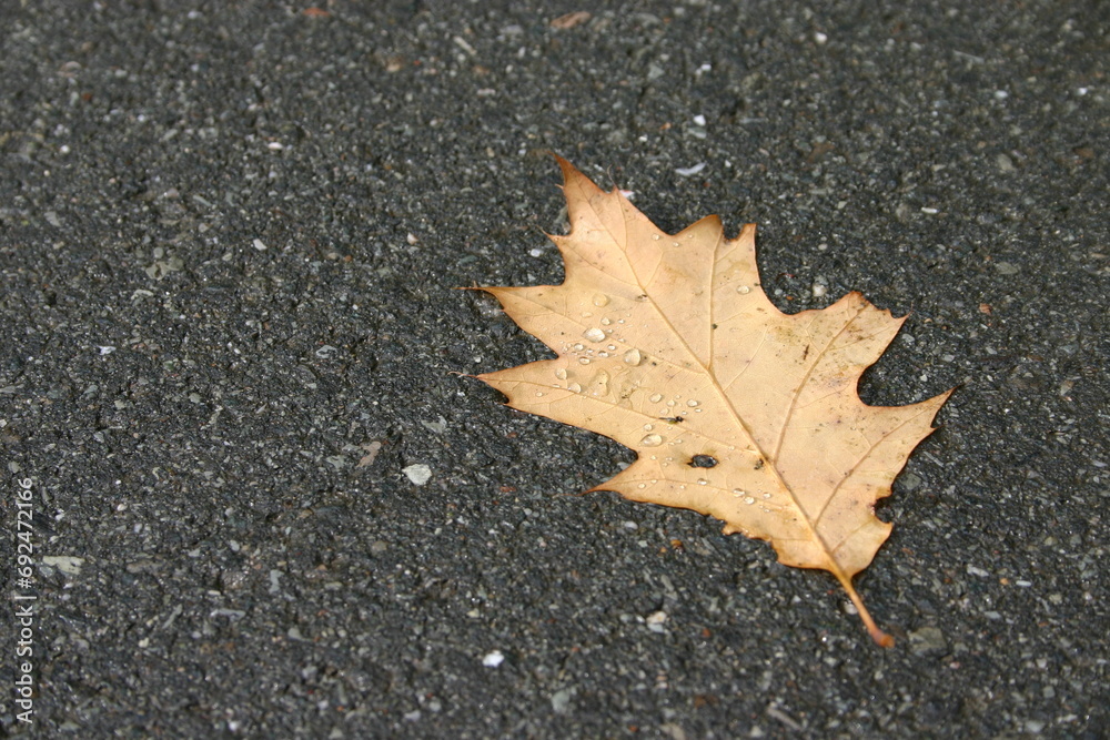 Eichenblatt mit Wassertropfen / Tautropfen auf dunklem Asphalt