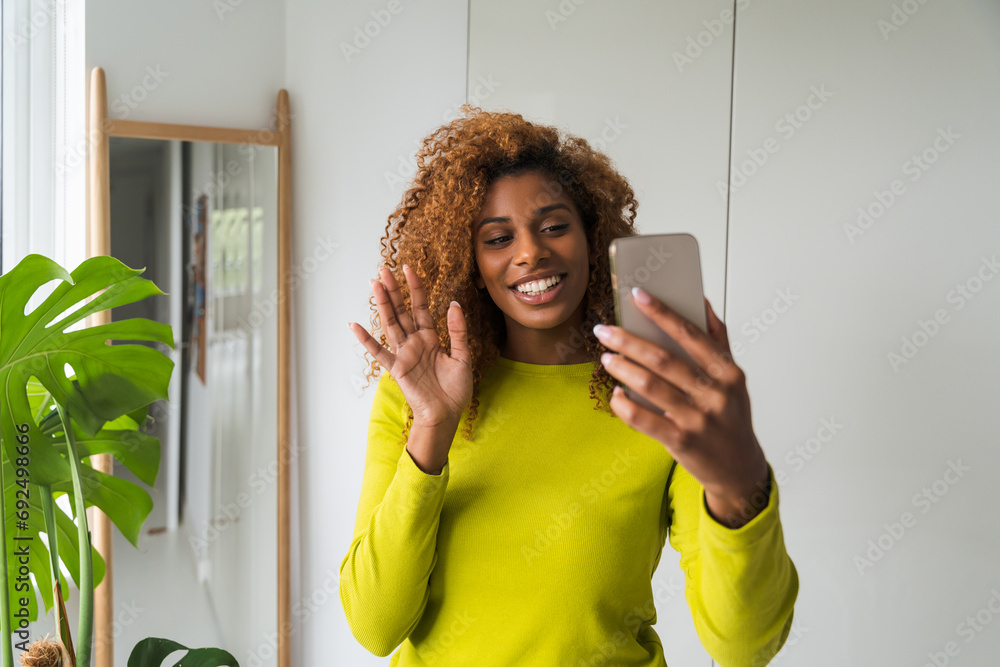 African american happy woman video calling mobile phone