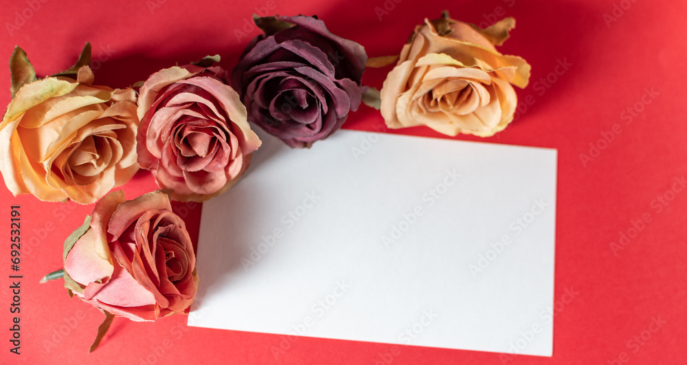 Summer spring blossom blooming empty paper card on red table, flowers for celebration.