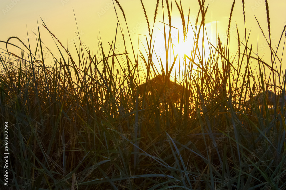Sunset through the tall grass, a wooden observation tower in the background